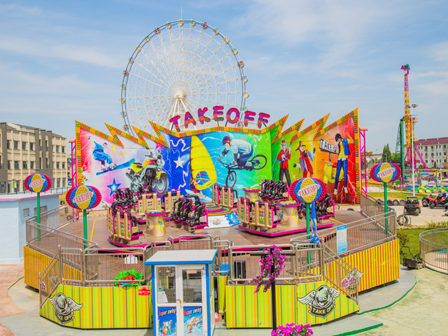 起飞,亦称旋转乾坤。是我公司继新型火箭蹦极和星际巴士后,开发的国内首台陀螺类大型游乐设施。采用先进的液压、变频技术和无基础式结构。运行中,乘坐者不仅随座舱自转而且随大转盘公转,同时大转盘在运行过程中可做可变倾角升降,使乘客充分体验全新的复合乐趣。该设备造型宏伟、装饰豪华,是游乐场所及嘉年华活动中不可多得的游乐精品。